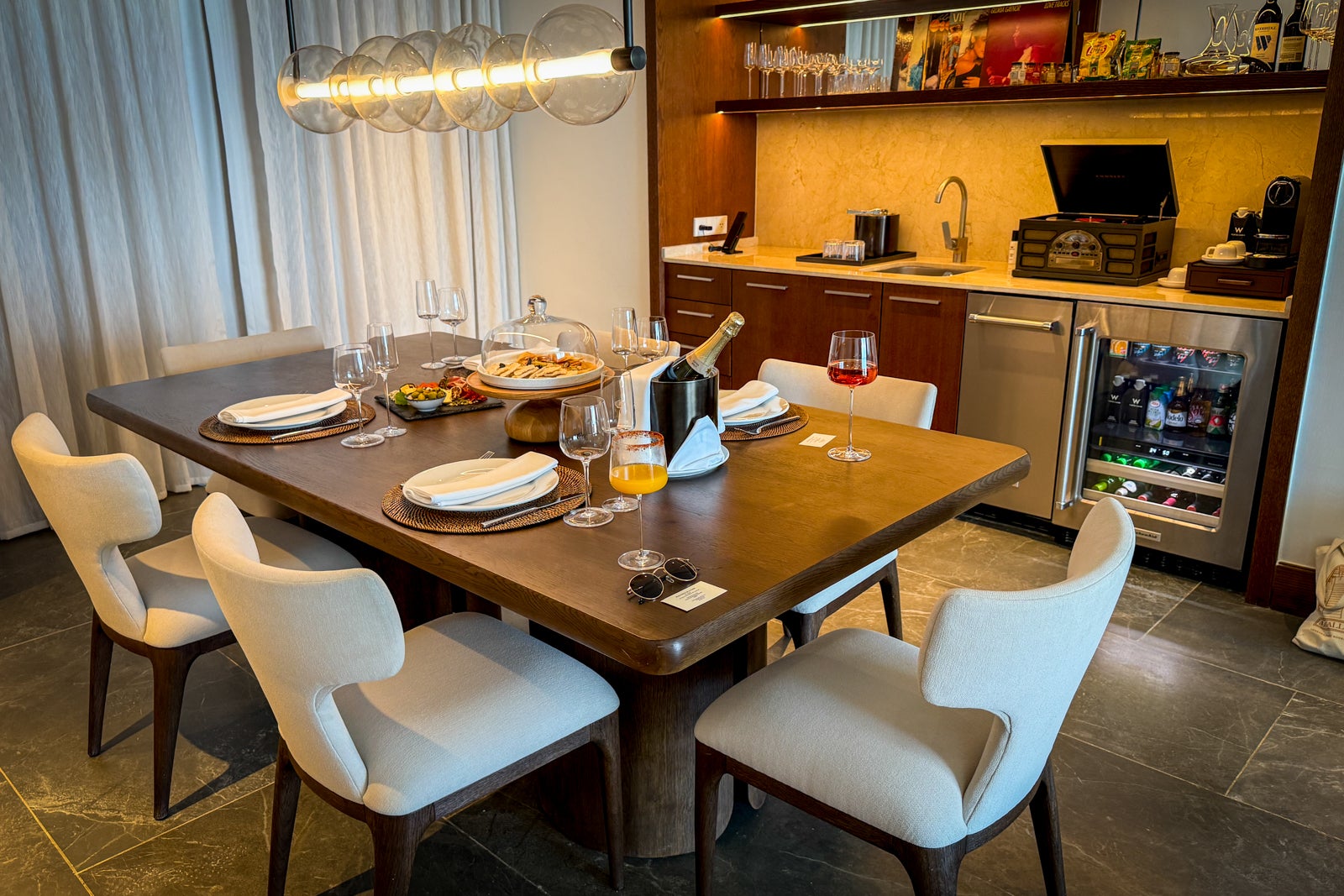 Across from the living room, our suite had a dining room with a large table and a wet bar area with a record player (and a special, curated selection of records for us), a coffee maker, snacks like chips and nuts, and a minifridge loaded with various beers (local and imported) and bottles of wine, sodas and juices.