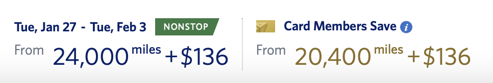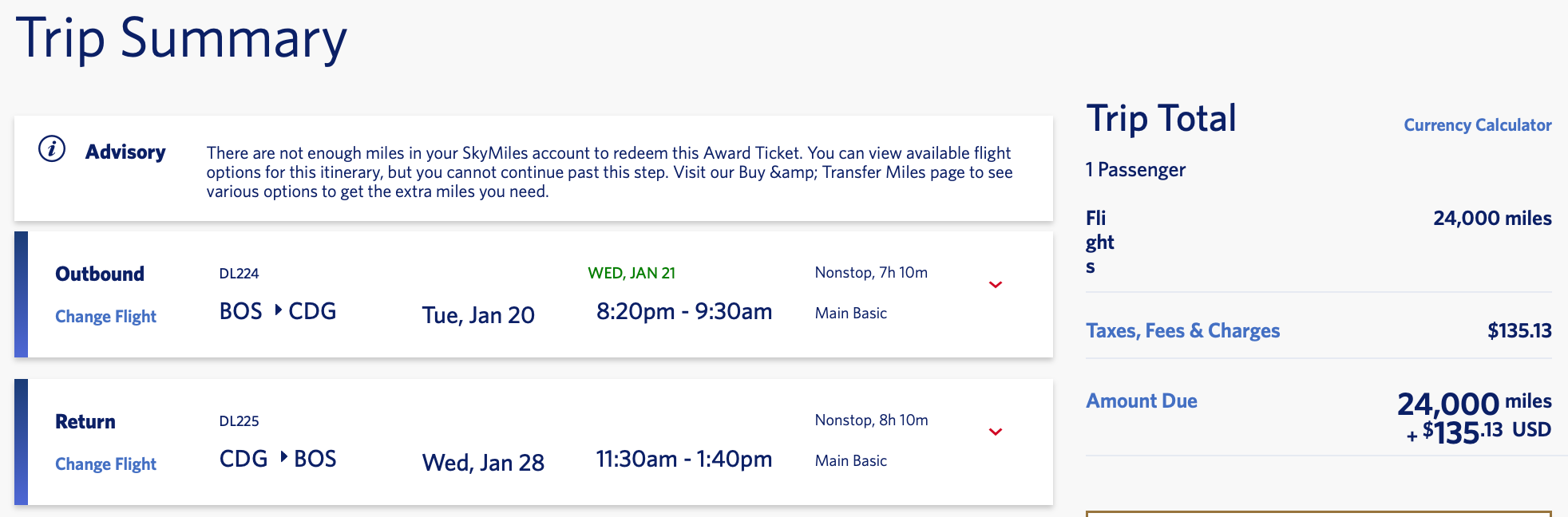 Once we did that, we were able to see that we have lots of options to fly from John F. Kennedy Airport (JFK) to Charles de Gaulle Airport (CDG) in January or February from 24k SkyMiles plus $136 in taxes/fees. If you book the trip with a Delta cobranded American Express card, you save an extra 3,600 points.