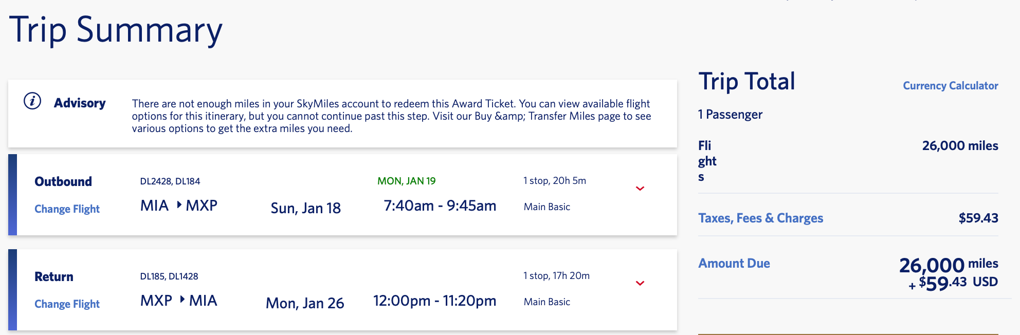 I found the same sweet deal from Miami to Milan, Italy. There is good availability flying out of my home airport of Miami International Airport (MIA), to Milan Malpensa Airport (MXP) in January for just 26,000 SkyMiles round-trip, plus $59.43 in taxes. If you book with a Delta cobranded credit card, you’ll save an additional 4,000 miles. This itinerary includes a layover at JFK.