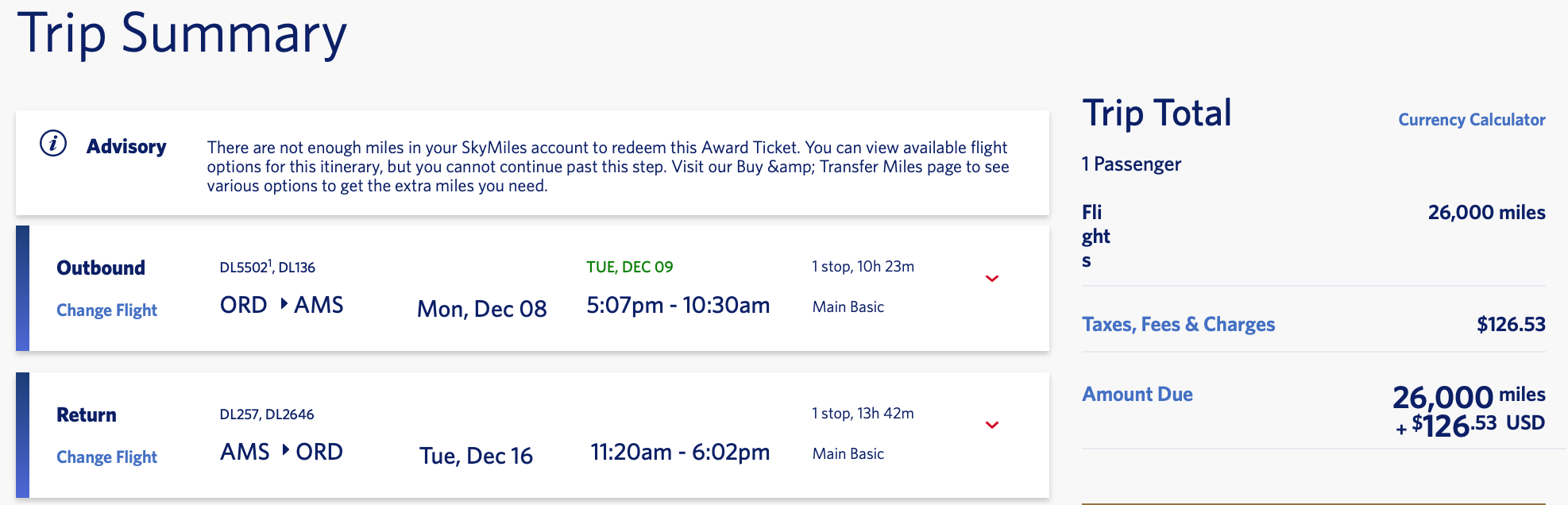 If you live in Chicago and have a flexible travel schedule, there’s a great deal available to the Netherlands. You can book a round-trip flight from Chicago O’Hare International Airport (ORD) to Schiphol Airport in Amsterdam (AMS) in early December for 26,000 points and $127 in fees. There is a layover each way.