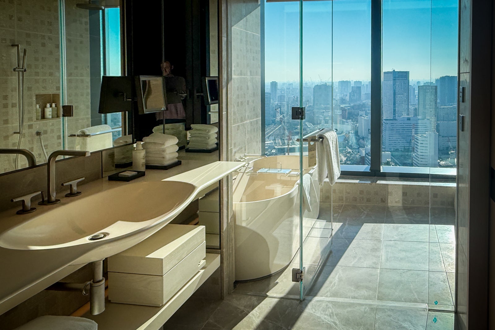 The real star of my guest room was the bathroom, where a large soaking tub in its own entirely-glass room filled with sunlight during the day and offered twinkling views of the Tokyo skyline at night. After a long soak, a rainfall shower was ideal for a rinse.