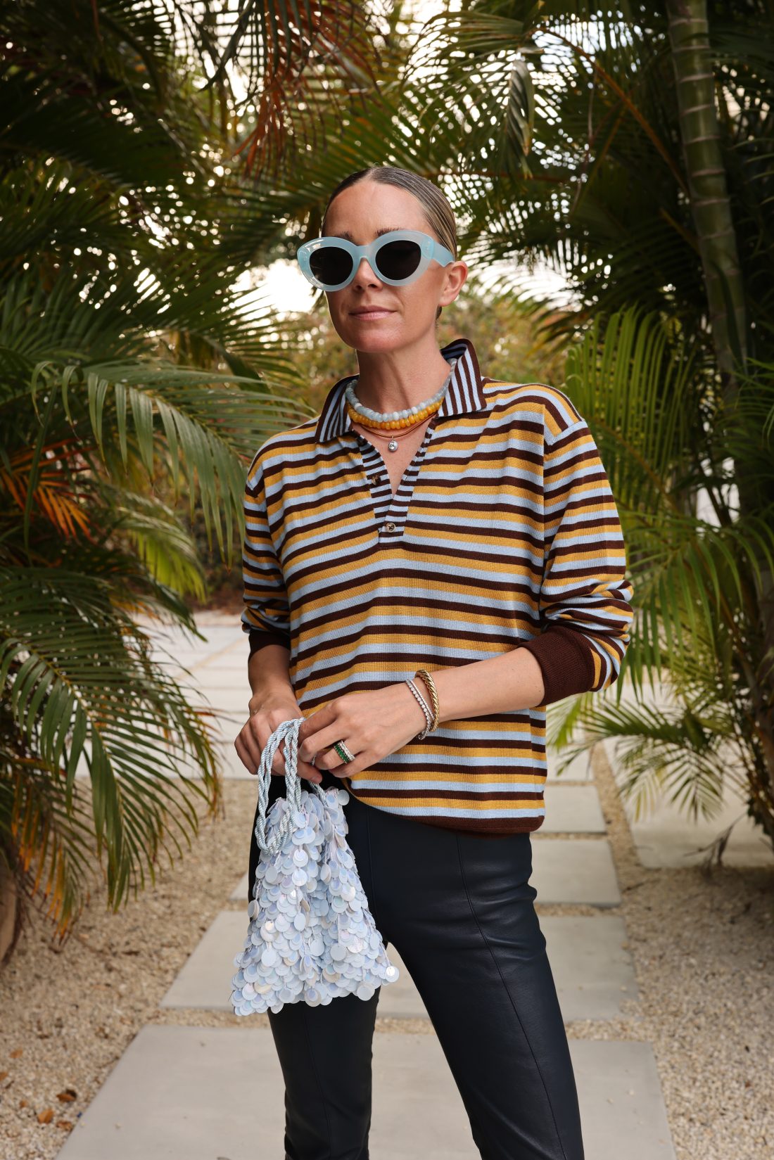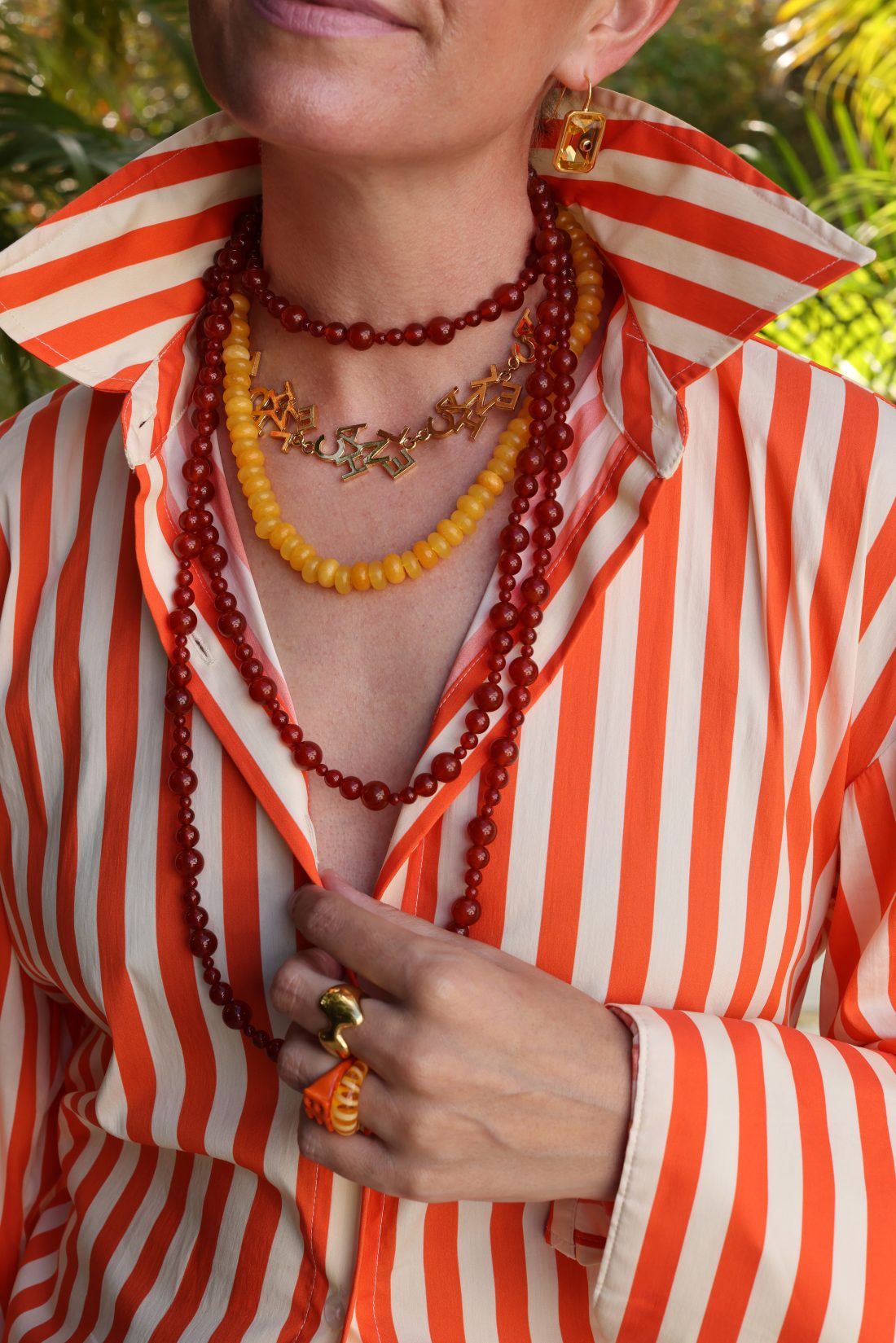 Let’s style some warm tones. Pairing one of my favorite BaubleBar necklaces (I own it in multiple colors) with this new-to-me Chanel necklace and this long strand (that can be doubled or tripled). The earrings are by Lizzie Fortunato and the striped top is from Simon Miller!